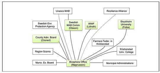 The nodes in a governance network consist of key individuals who belong to an organization. In some cases (shaded boxes) these individuals invented their own mandate within their respective organisation. This figure illustrates the governance network of Kristianstads Vattenrike Biosphere Reserve (KVBR) (Hahn 2011).