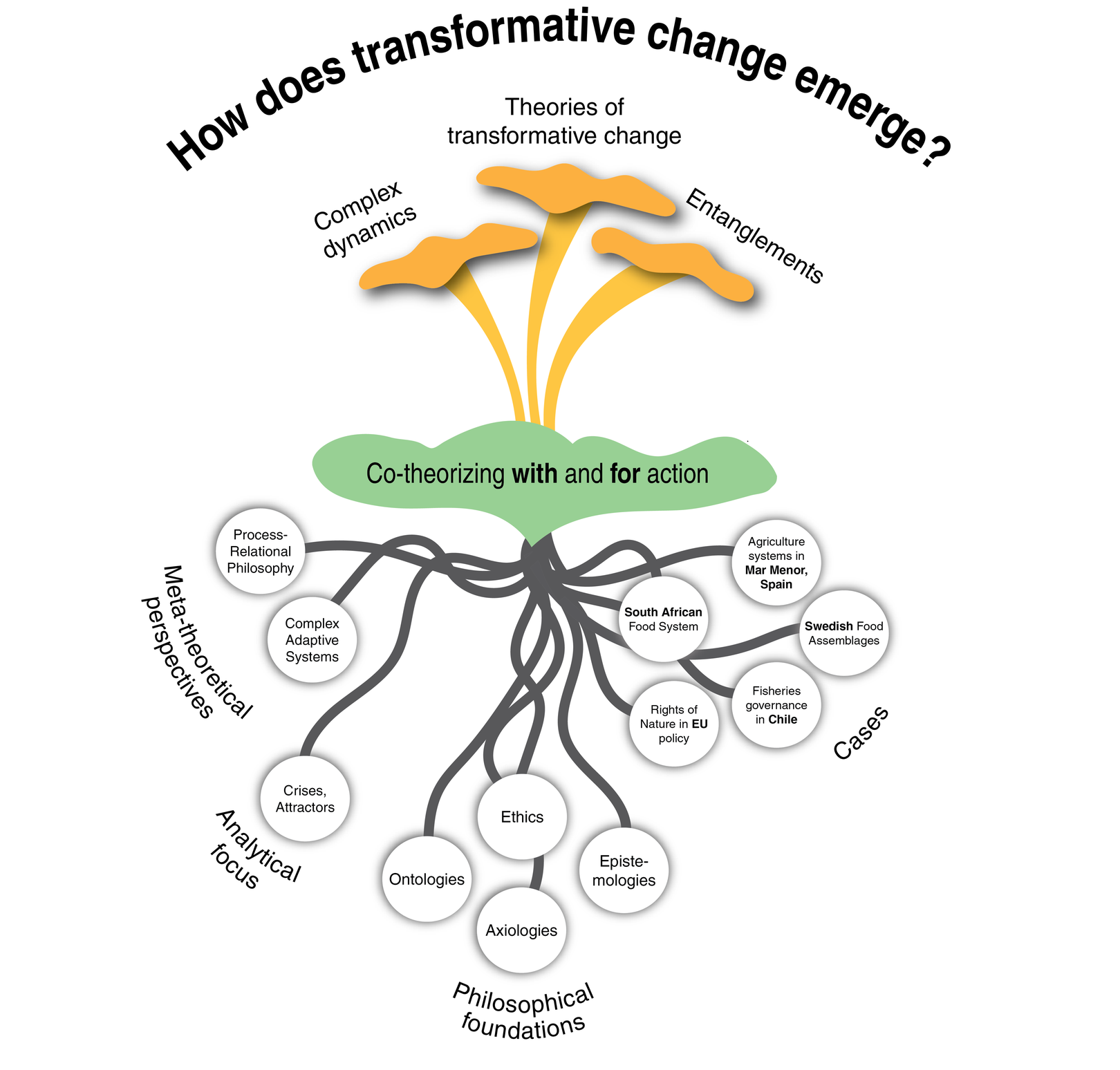 The project brings two theoretical perspectives into dialogue: complex adaptive systems and process relational, in order to deepen our understanding of transformative change and facilitate new ways of thinking about and with change. We will pursue the project’s objectives through a multi-method approach that combines conceptual and empirical work using qualitative methods, arts-based methods and simulation modelling in iterative and reflective processes. We aim to theorize transformative change through i) studying past transformative change, e.g. of marine governance in Chile, ii) investigate ongoing change of environmental governance in the context of rights of nature in Europe, and iii) co-produce knowledge about transformative change in food systems in Sweden and South Africa. The latter aims to develop a mode of practice-based theorizing where understanding is generated while addressing real-world problems. Together, these activities will serve the development of complexity-aware theories of transformation that are useful for action.