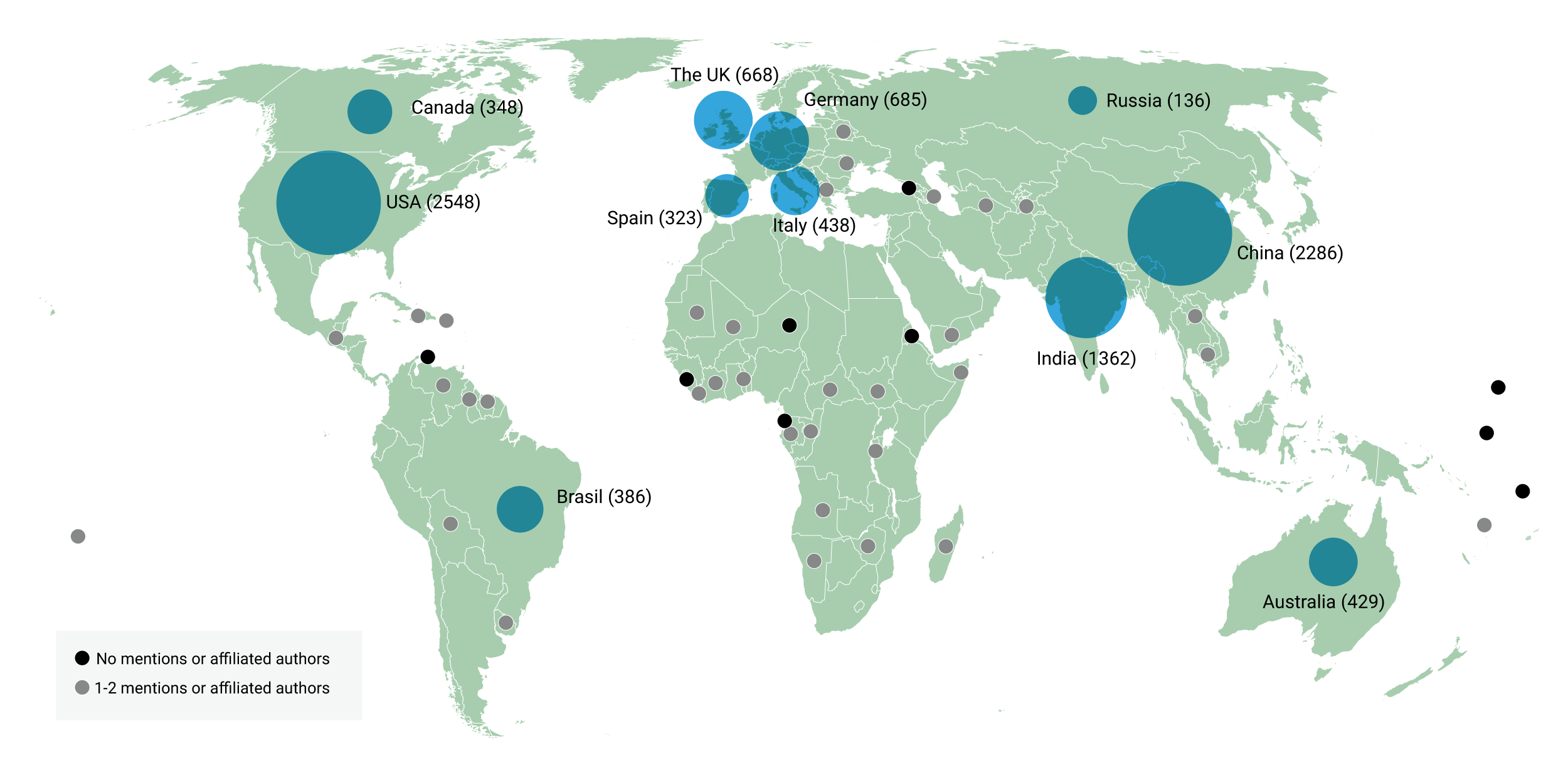 Fig. 2. The number of occurrences of the ten most frequently mentioned countries, along with a selection of the least frequently mentioned ones (chosen to illustrate overall geographical distribution), including affiliations of first and second authors, across the >8,500 studies on AI and the sustainability sciences included in our literature review. Large world economies dominate, such as the USA, China, India, and countries in Western Europe. Map produced by Maria Schewenius.